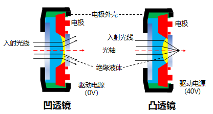 酷聚利用电湿润原理来改变两种互不相溶的水相和油相透明液体之间的界面曲率